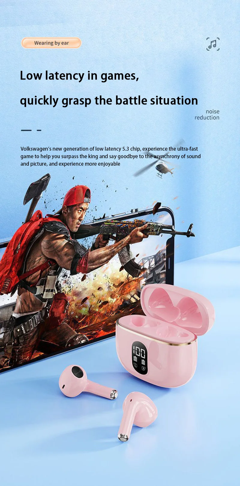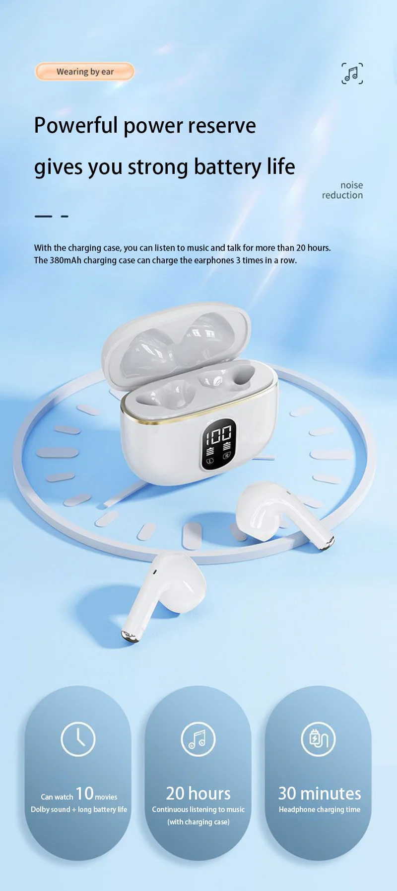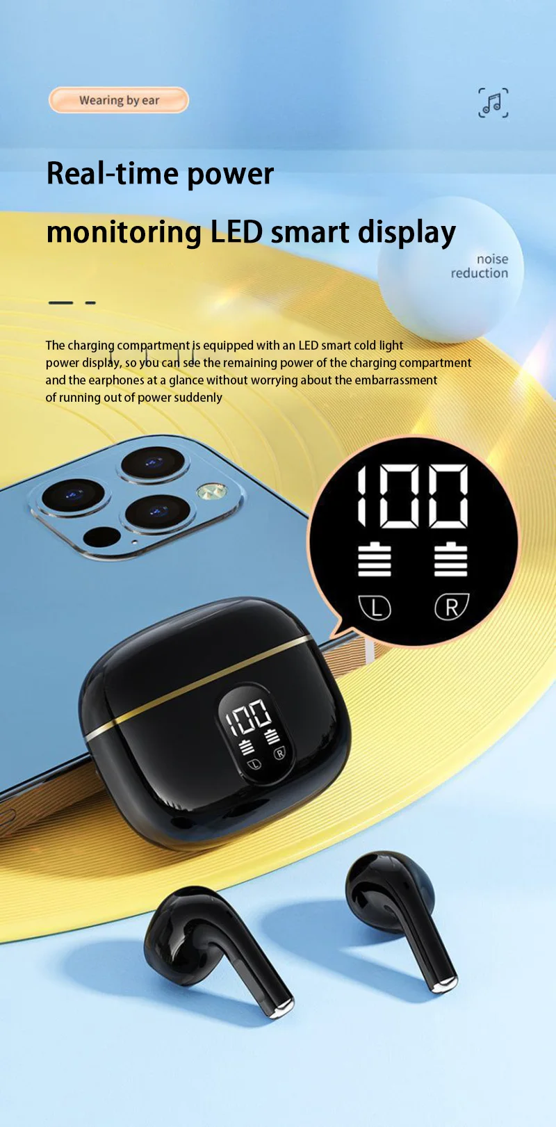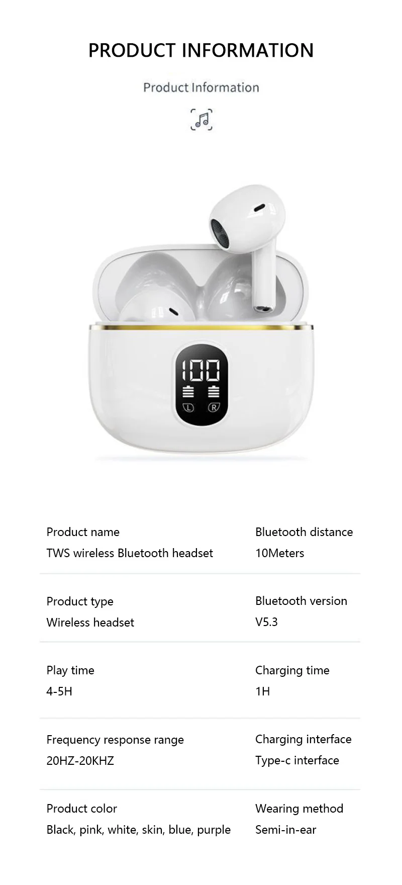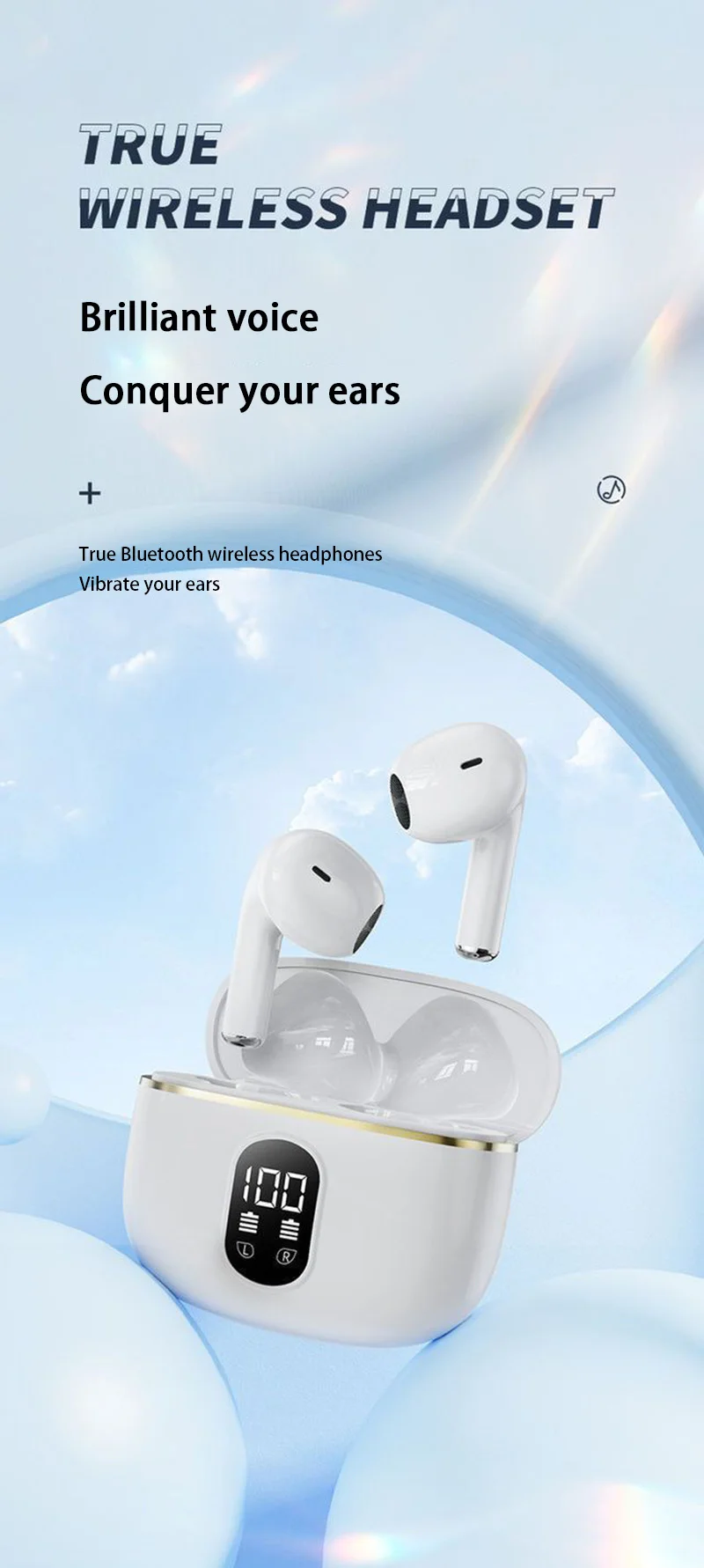 Écouteurs sans fil Bluetooth 5.3 haute fidélité avec technologie stéréo immersive. Dotés d'une batterie longue durée avec affichage de puissance en temps réel, ces écouteurs offrent une autonomie fiable pour vos déplacements. Compatible avec iPhone, Samsung, Huawei et tous les appareils Bluetooth. Design ergonomique et léger pour un confort prolongé. Profitez d'une connexion stable et d'une qualité audio cristalline, idéale pour la musique, les appels et le divertissement quotidien.